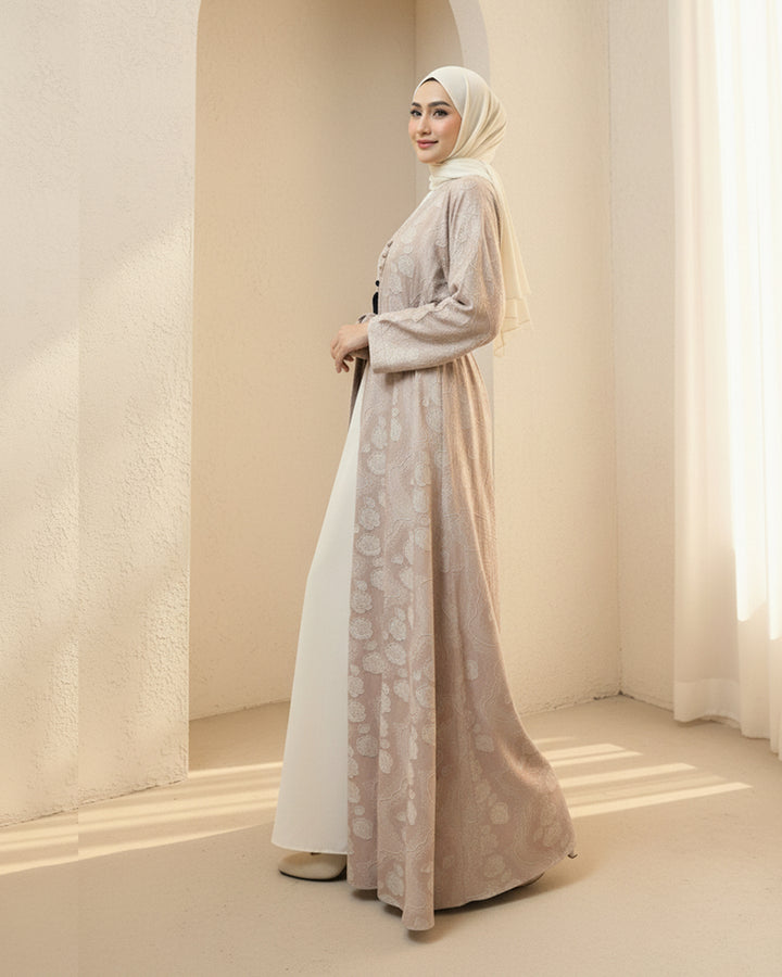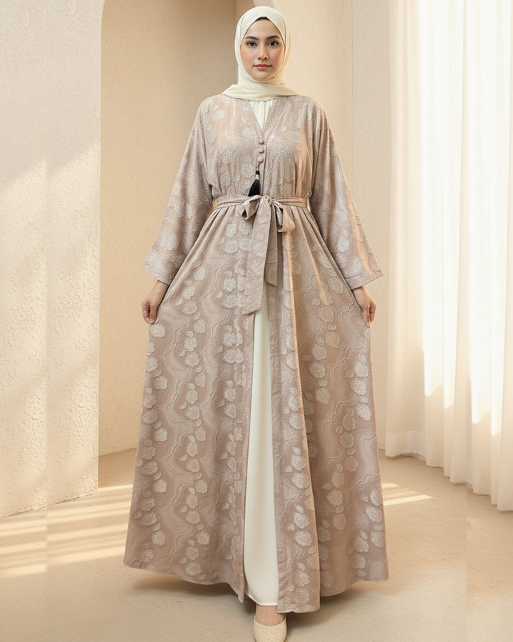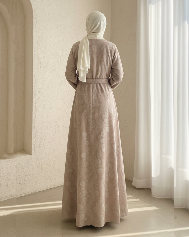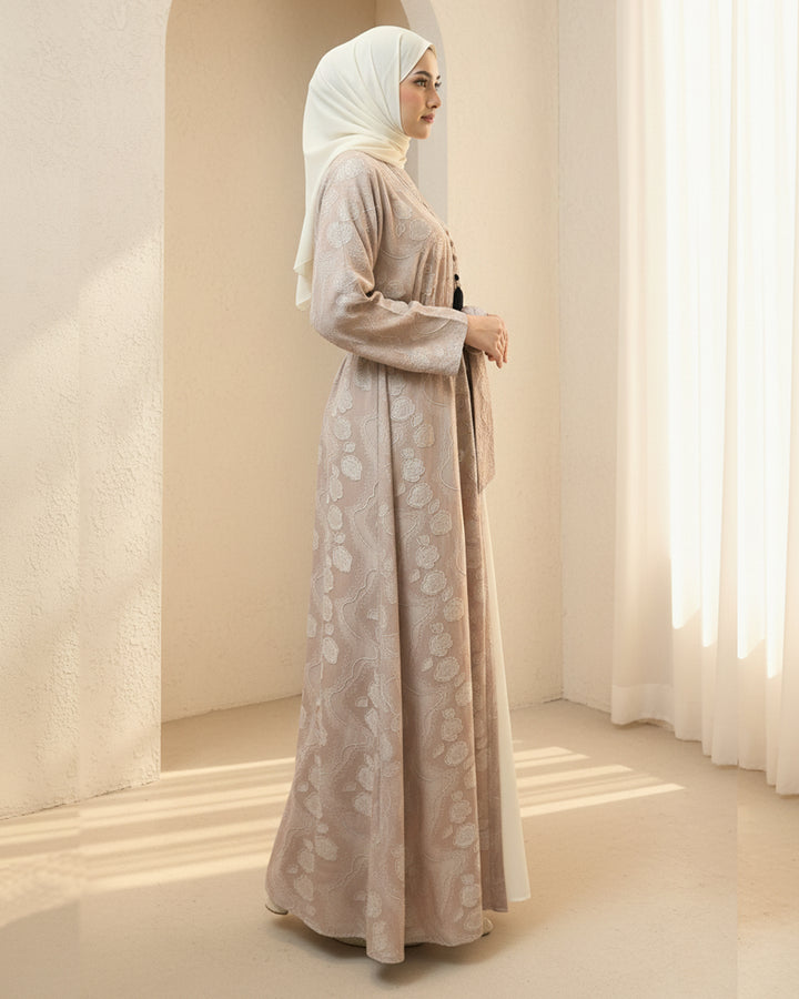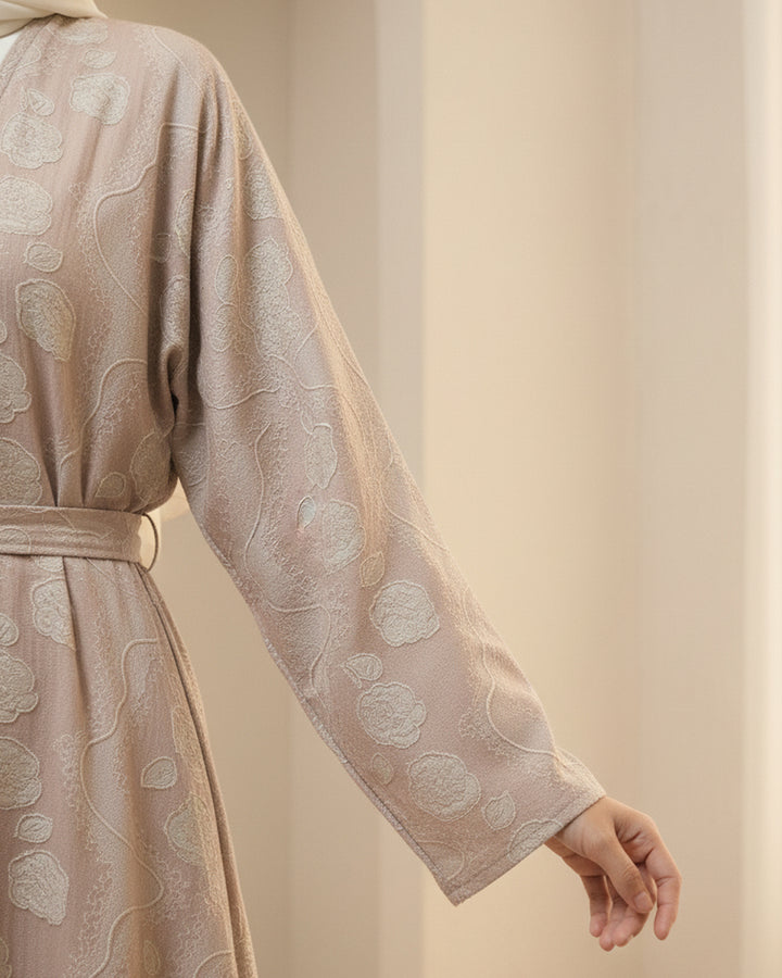 Elevate your modest wardrobe with this stunning open-front abaya, crafted from premium jacquard fabric featuring an intricate all-over rose pattern. The warm beige tone and subtle sheen give it a timeless elegance, perfect for both formal occasions and sophisticated everyday wear.