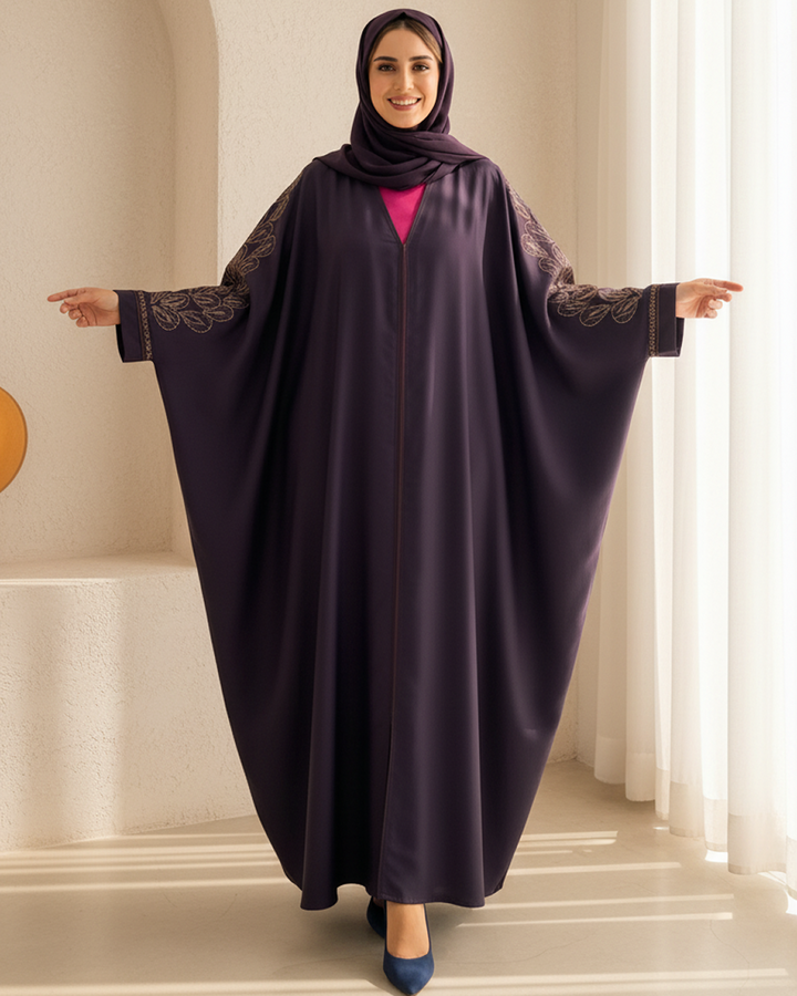 Add a touch of royal elegance to your wardrobe with this plum purple kaftan abaya for women, crafted from high-quality Nida fabric for a soft, breathable, and luxurious feel. Designed in a loose, flowing silhouette with wide sleeves, this embroidered abaya features delicate gold detailing on the sleeves, making it perfect for both festive and formal occasions.