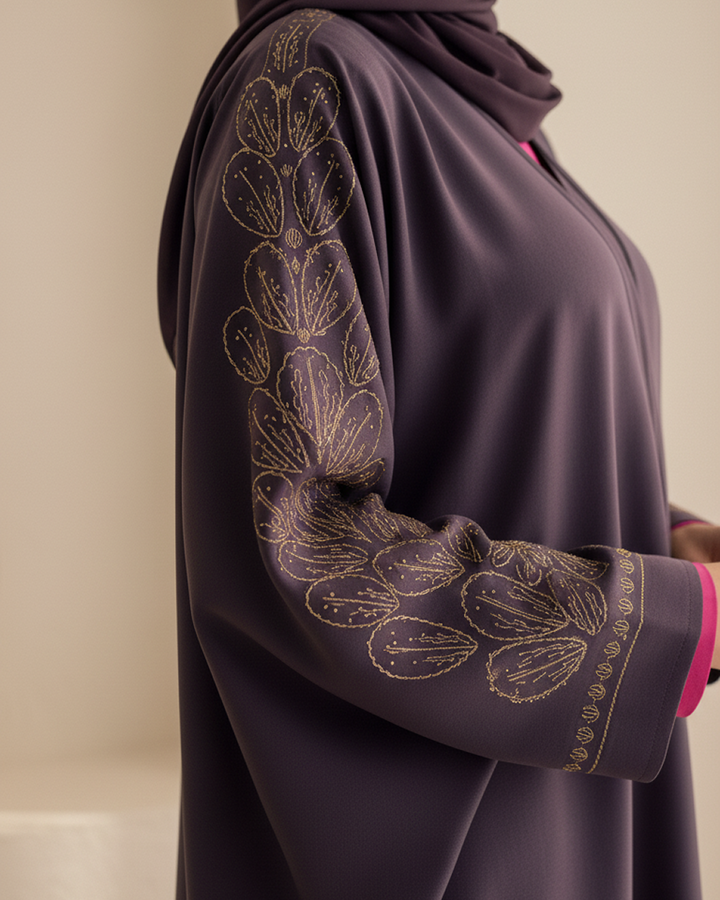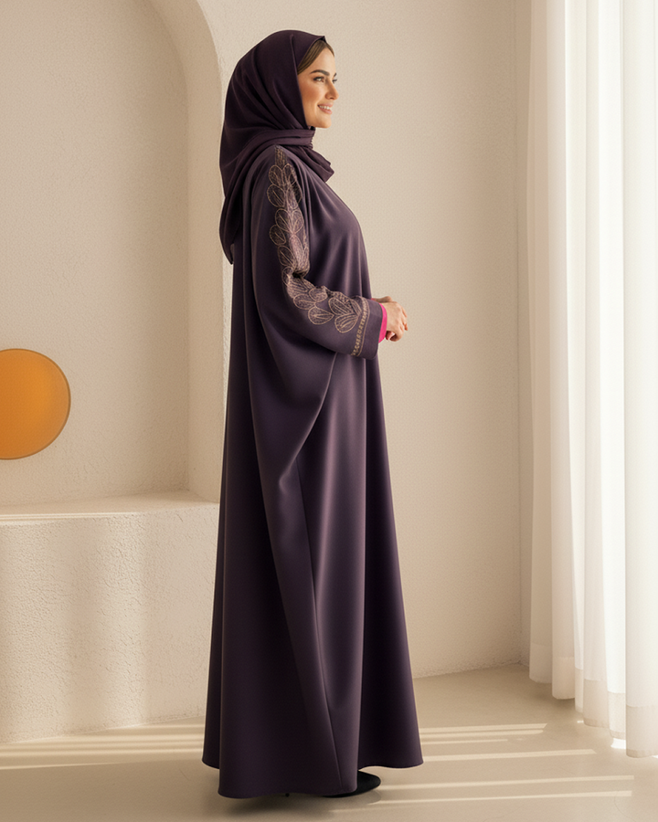 Plum Purple Embroidered Kaftan Abaya – Nida Fabric with Gold Sleeve Detailing
