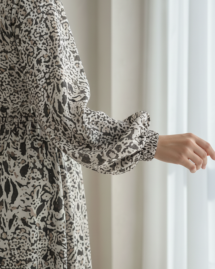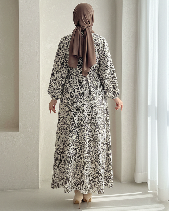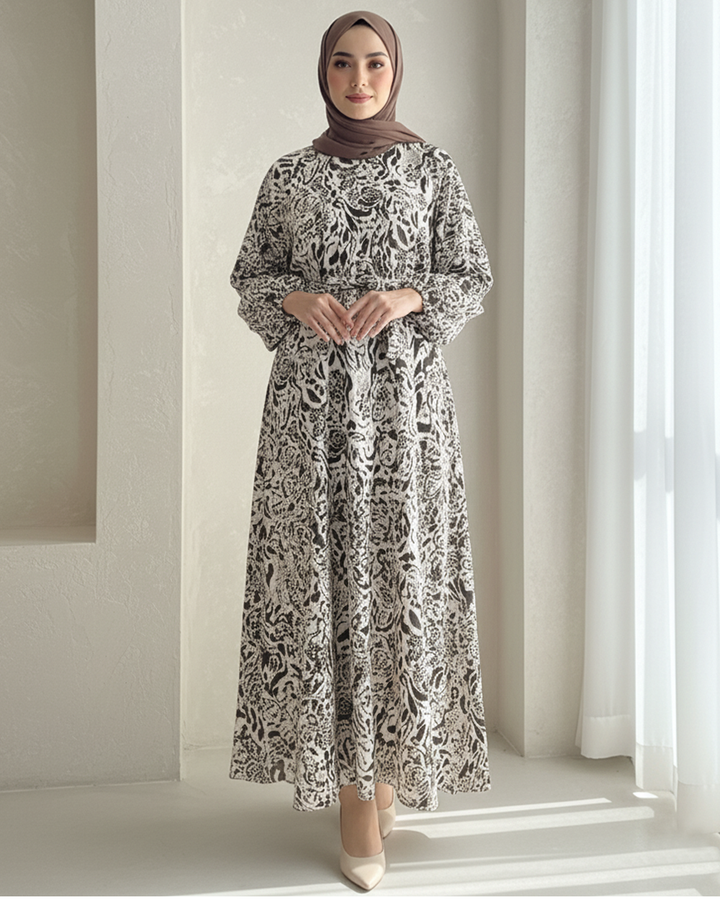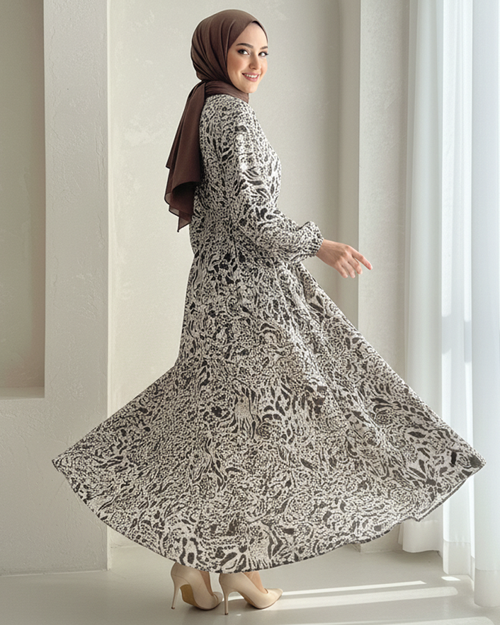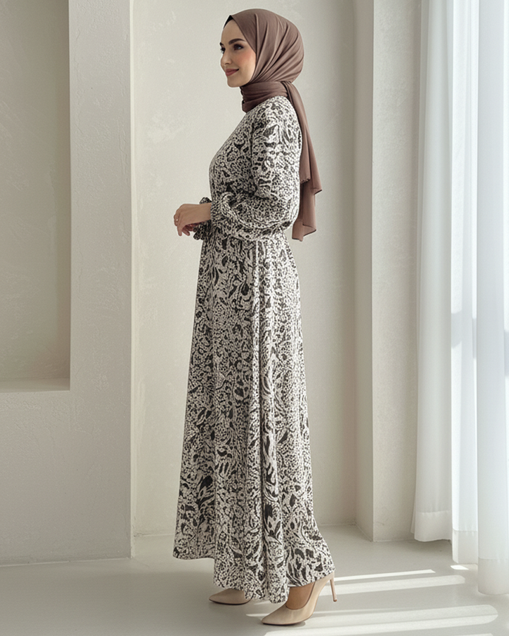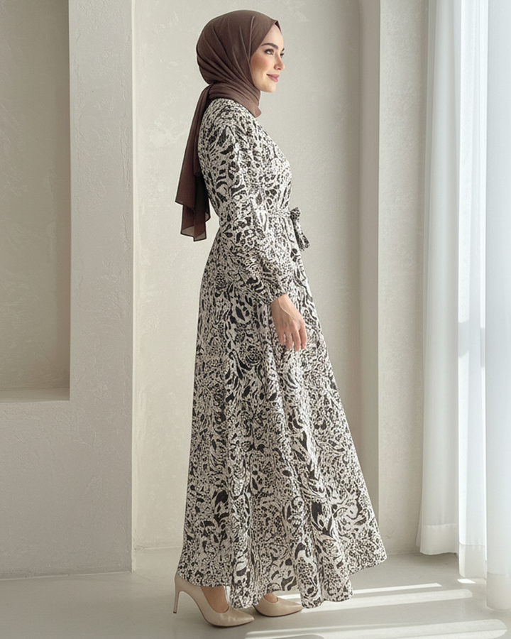 Printed Chiffon Maxi Dress – Belted Design with Shrinkable Cuffs