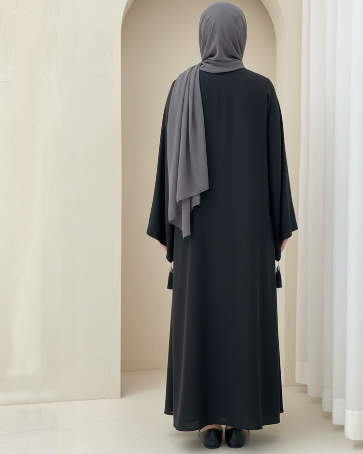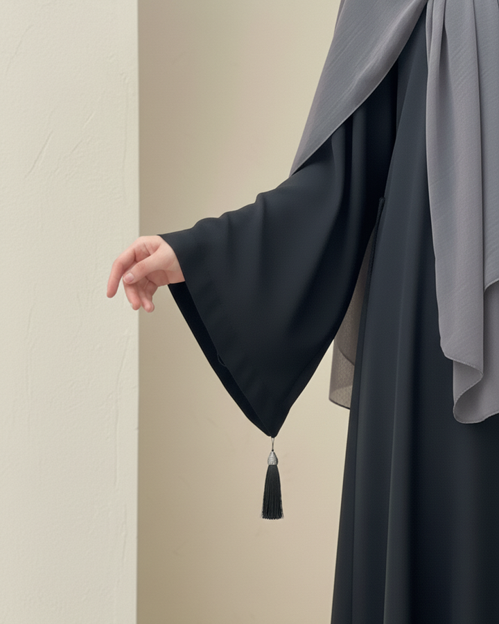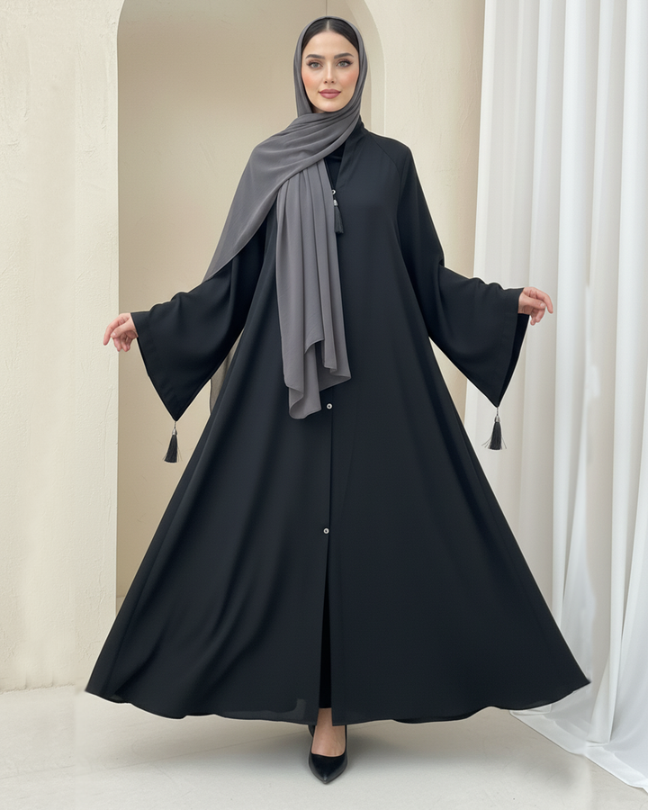 Black Nida Umbrella Style Open Abaya with Cuff Tassels – Size 54
