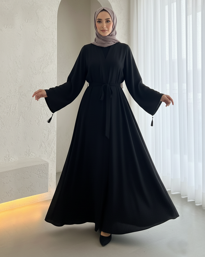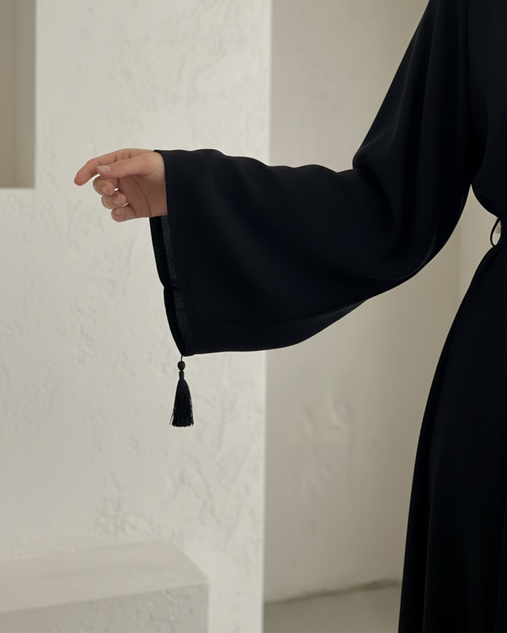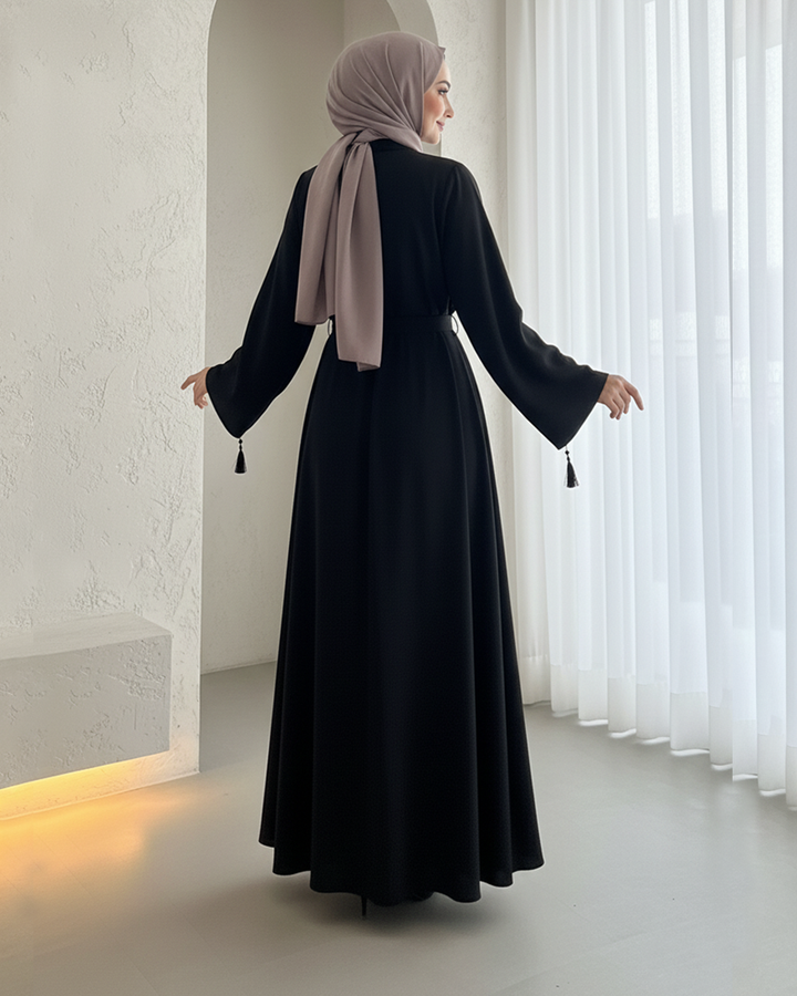 Elegant Black Abaya with Belt & Tassel Sleeve Details