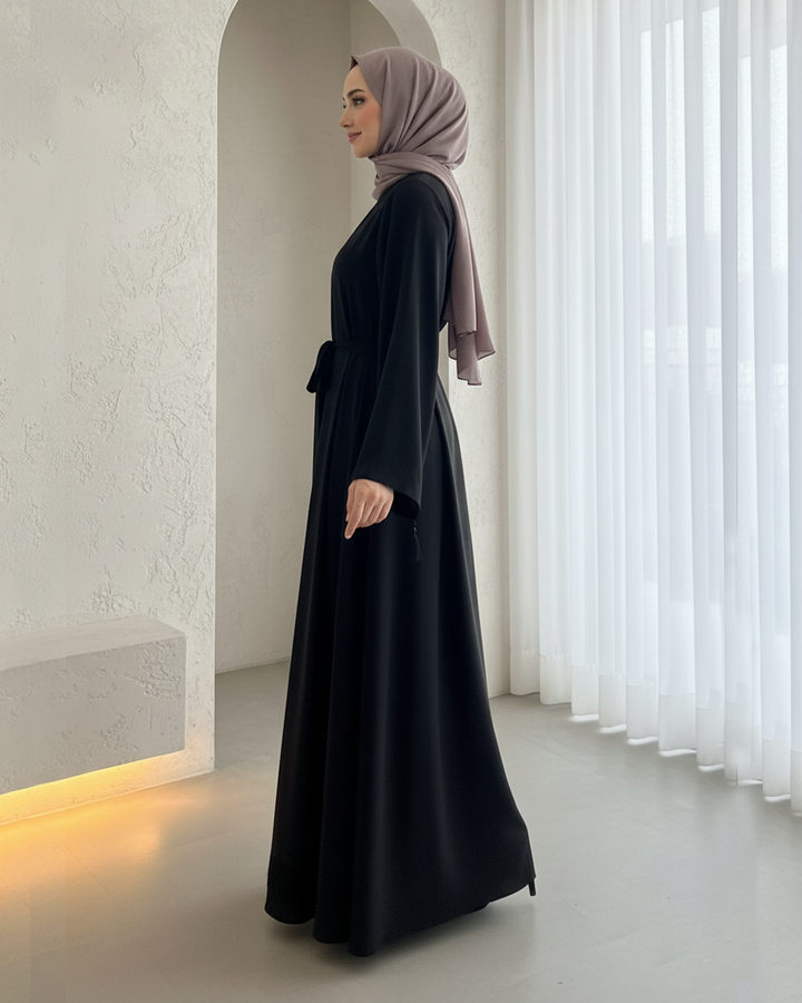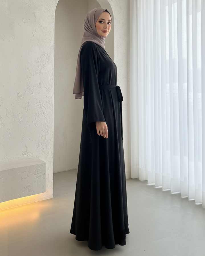 An effortlessly chic black abaya designed for modern elegance and timeless appeal. Crafted from high-quality, lightweight, and flowy fabric, this abaya offers a graceful drape and all-day comfort.