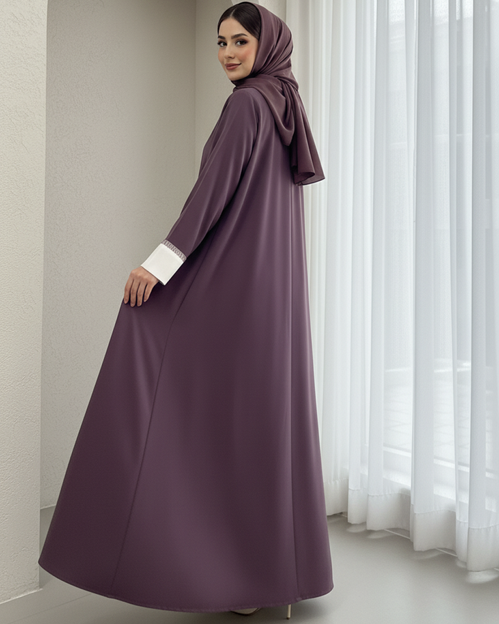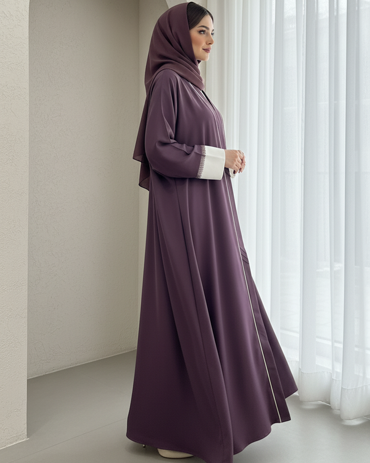 Elegant Deep Plum Open Abaya with Off-White Contrast Cuffs – Nida Fabric – Size 56