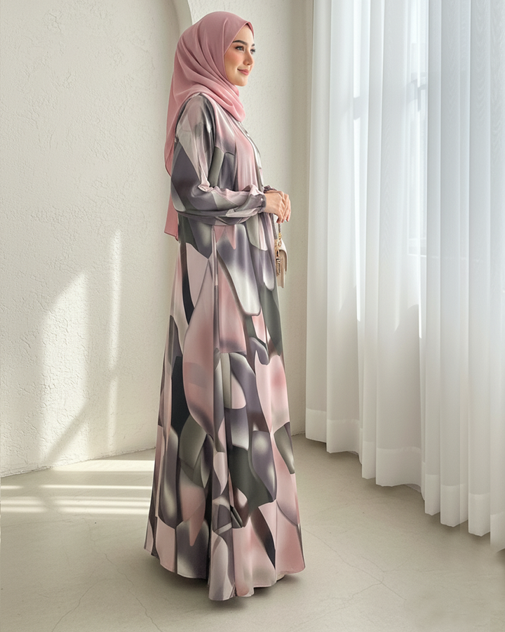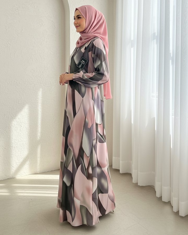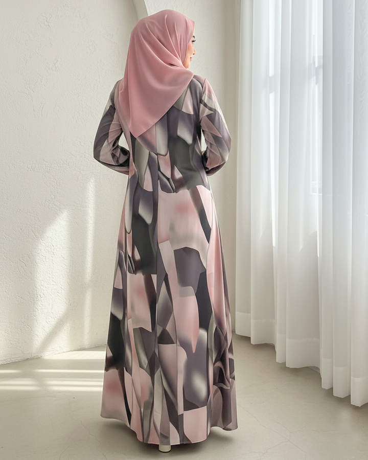 Elegant printed Maxi crafted from lightweight, flowy fabric, perfect for a sophisticated and modest look. The design features a blend of soft pink, sage green, and muted grey abstract patterns, creating a modern yet graceful aesthetic. It comes with a matching printed stole for a completely coordinated outfit.