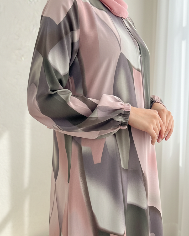 Elegant Printed Maxi with Matching Stole – Abstract Pink, Sage & Grey