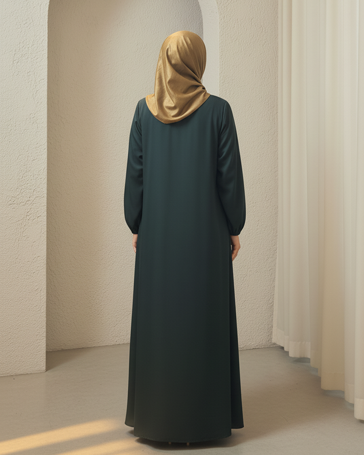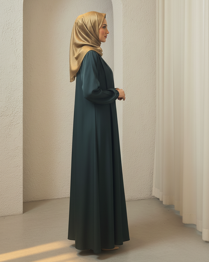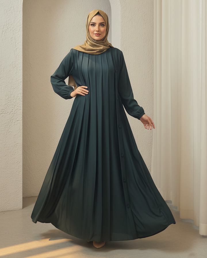 This elegant abaya is crafted from a smooth, flowy teal fabric that drapes beautifully for a sophisticated and modest look. The front features fine vertical pleats that add graceful movement, paired with a unique asymmetrical side button closure for a modern twist.