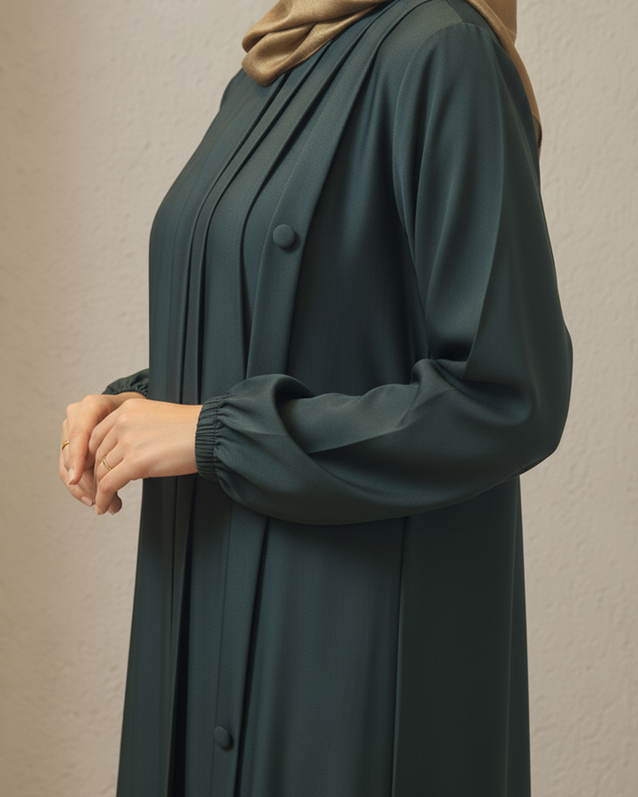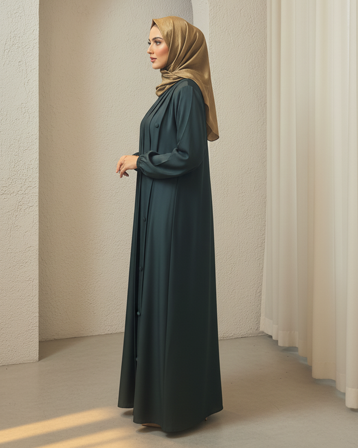 Teal Pleated Nida Abaya with Asymmetrical Side Button Detailing – Elegant Modest Wear